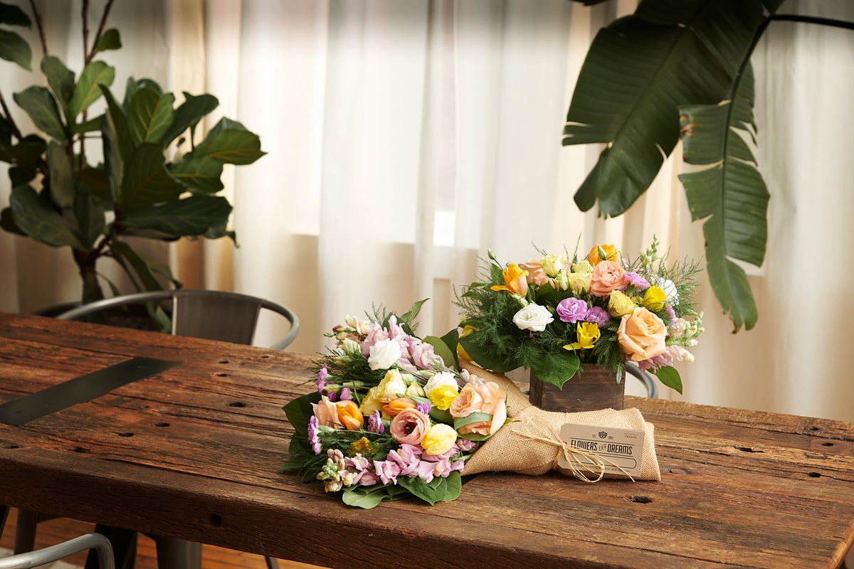 Definitely. We use durable blooms like alstroemeria, carnations, and bromeliads, selected based on seasonal availability to stay fresh for days. For even more longevity, consider a potted plant like a fern or laceleaf, which are low-maintenance and bring a bit of nature indoors.
